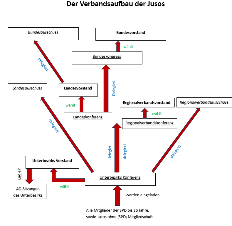Der Unterbezirksvorstand hat die Aufgabe, alle Juso-Aktivitäten im Unterbezirk zu vernetzen. Er ist für die organisatorischen Aufgaben zuständig und bereitet die Diskussionen der Ausschüsse vor. Er kontrolliert die Umsetzung der gefassten Beschlüsse und vergebenen Aufgaben. Er vertritt den Unterbezirk gegenüber der Partei und der Öffentlichkeit.